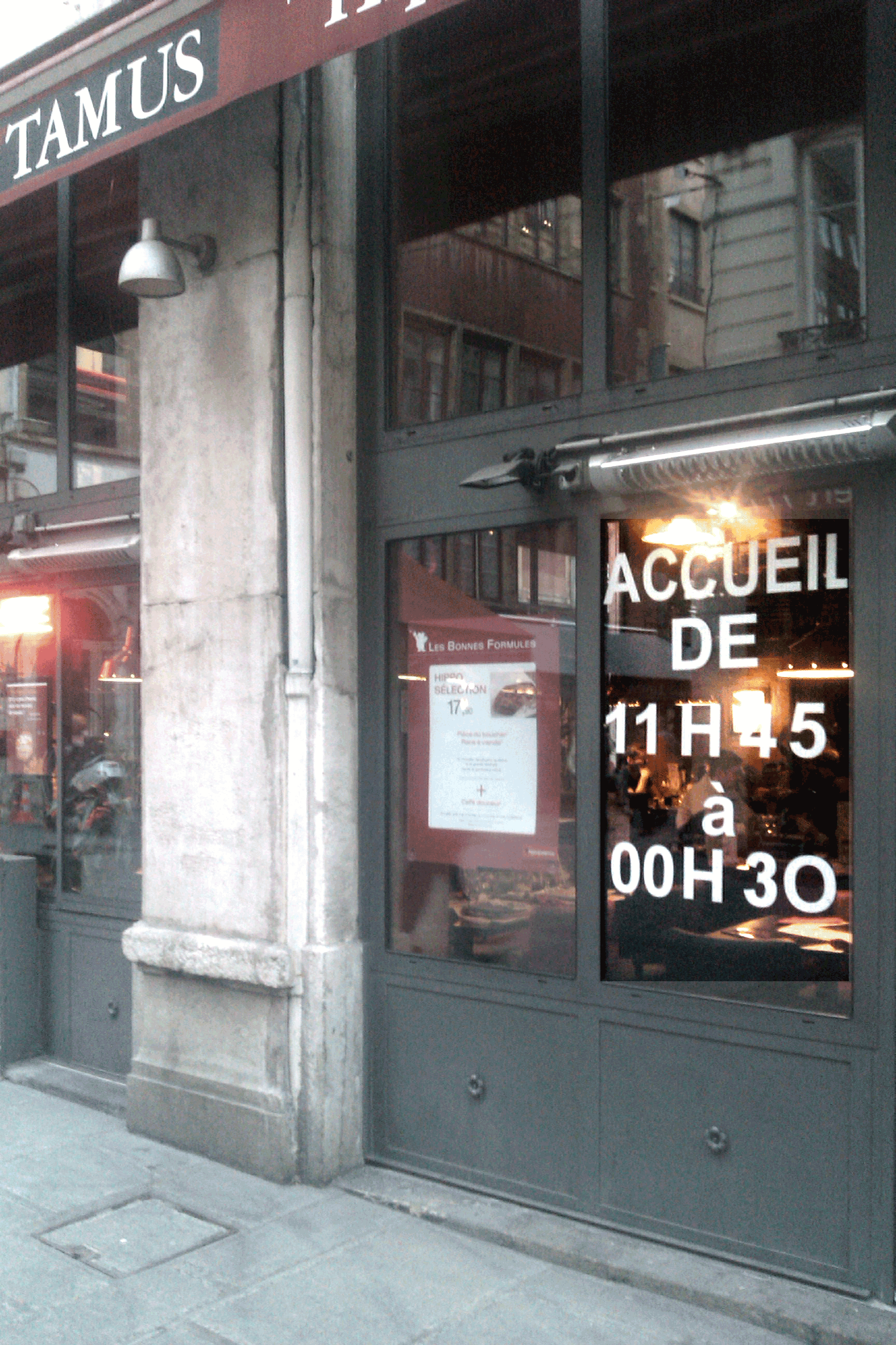 Hier, dimanche donc, nous sommes arrivés à l’Hippopotamus de la rue Mercière (Lyon) à 15h40. À l’extérieur du resto, un néon intermittent annonçait la fin de la course: « service continu 7/7 ». Parfait.