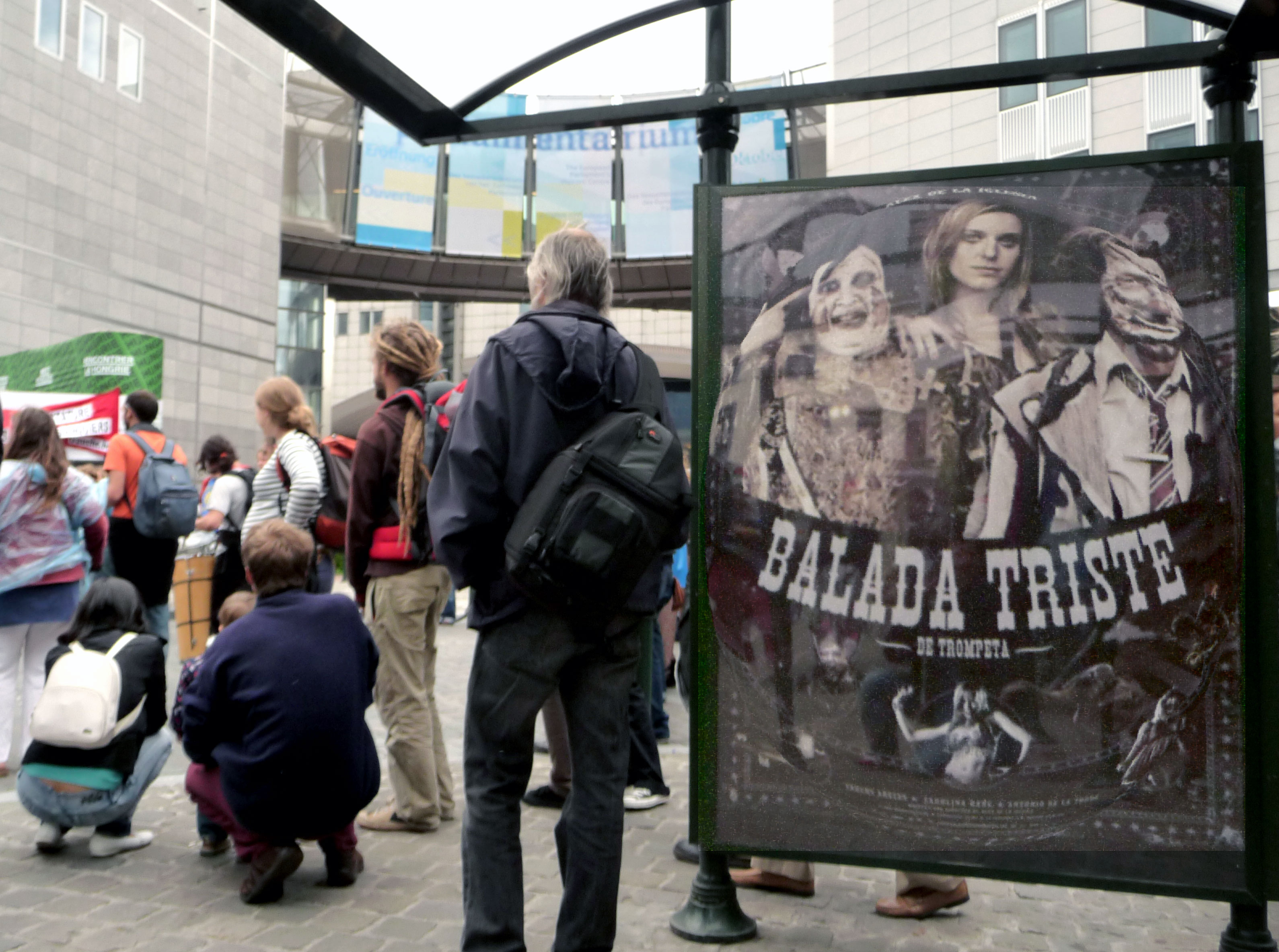 De hecho, ya sabía que se estrenaba por el semanario gratuito Agenda, pero me hizo gracia encontrarme este cartel en una parada de autobús de la plaza de Luxemburgo, enfrente del Parlamento Europeo, mientras se manifestaban los ‘indignados’ belgas el 19 de junio.