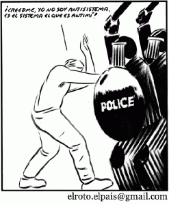 Ces manifestations ne sont pas un mouvement antisystème classique. » Je ne suis pas ‘antisystème’ c’est le systéme qui est ‘antimoi’, hurlent les manifestants. Un cris de guerre repris de l’oeuvre  du génial dessinateur de presse El Roto, de El País. (Découverte grâce à Zoé de Kerangat).