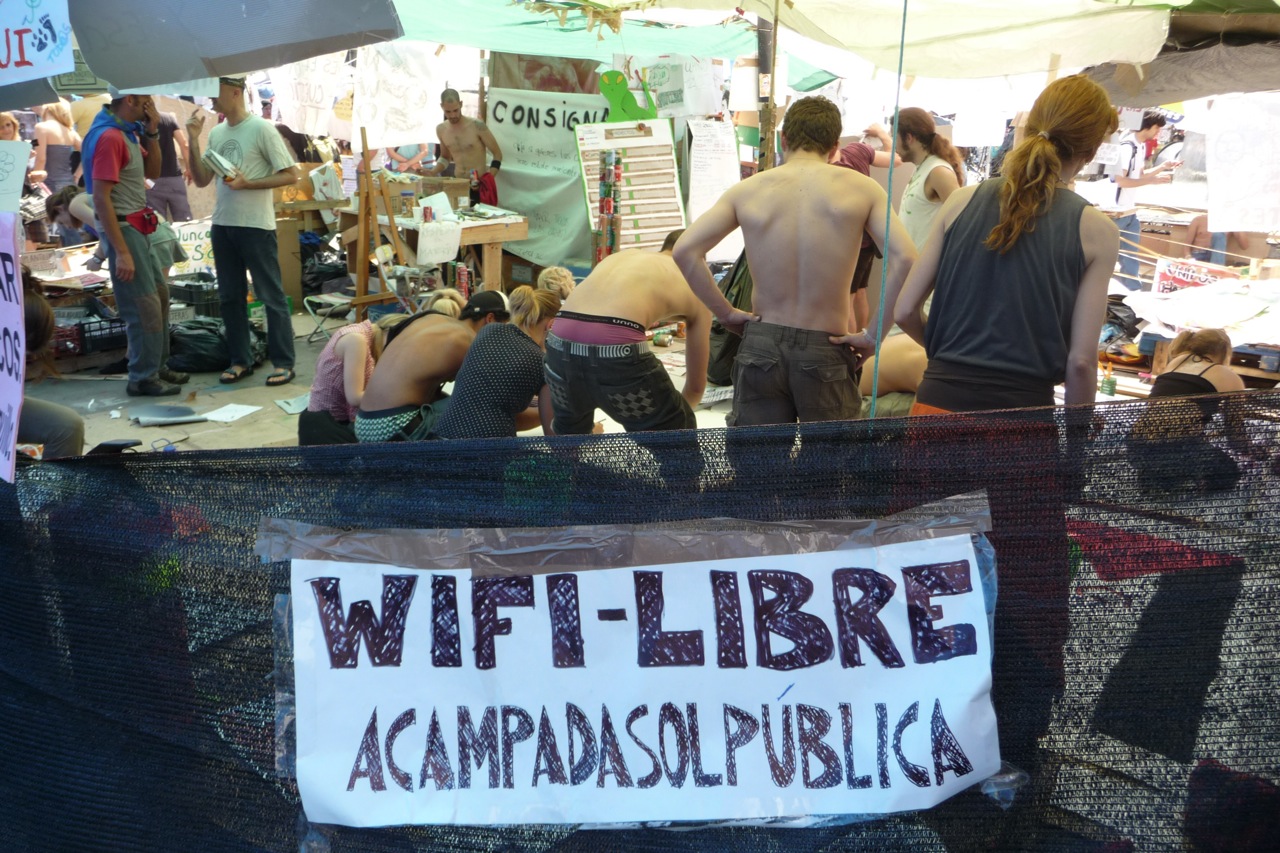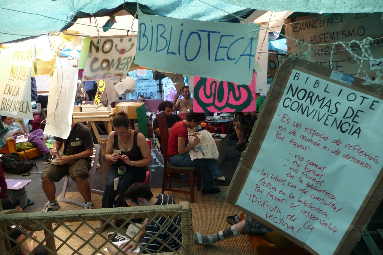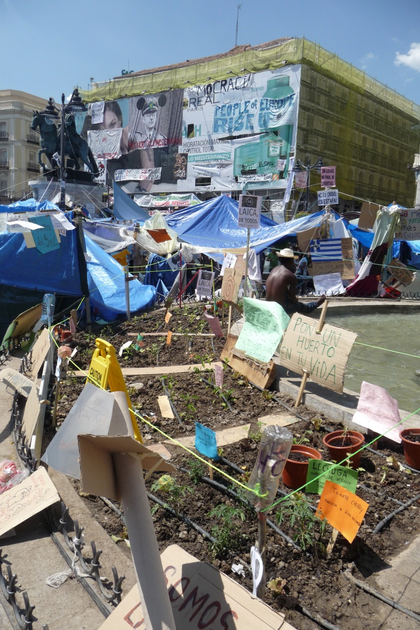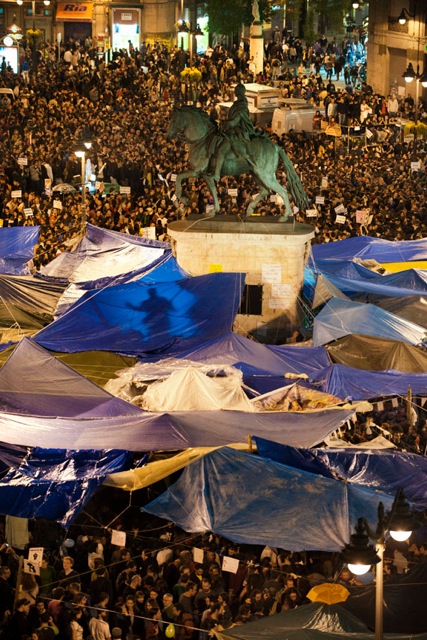 La place Tahrir espagnole (allez, n’ayons pas peur des clichés) est devenue une ville à l’intérieur d’une ville, service de garderie pour enfants inclu, des assamblées et commissions autogérés…
