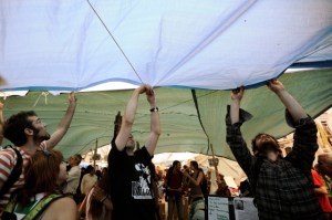 Ce campement de luxe est surtout soumis à une réflexion de fond sur les dysfonctionnements de la ‘Démocratie du marché’ actuel. Ils proposent des initiatives toutes fraîches en assemblées et construisent un réseau de débats sur Internet.