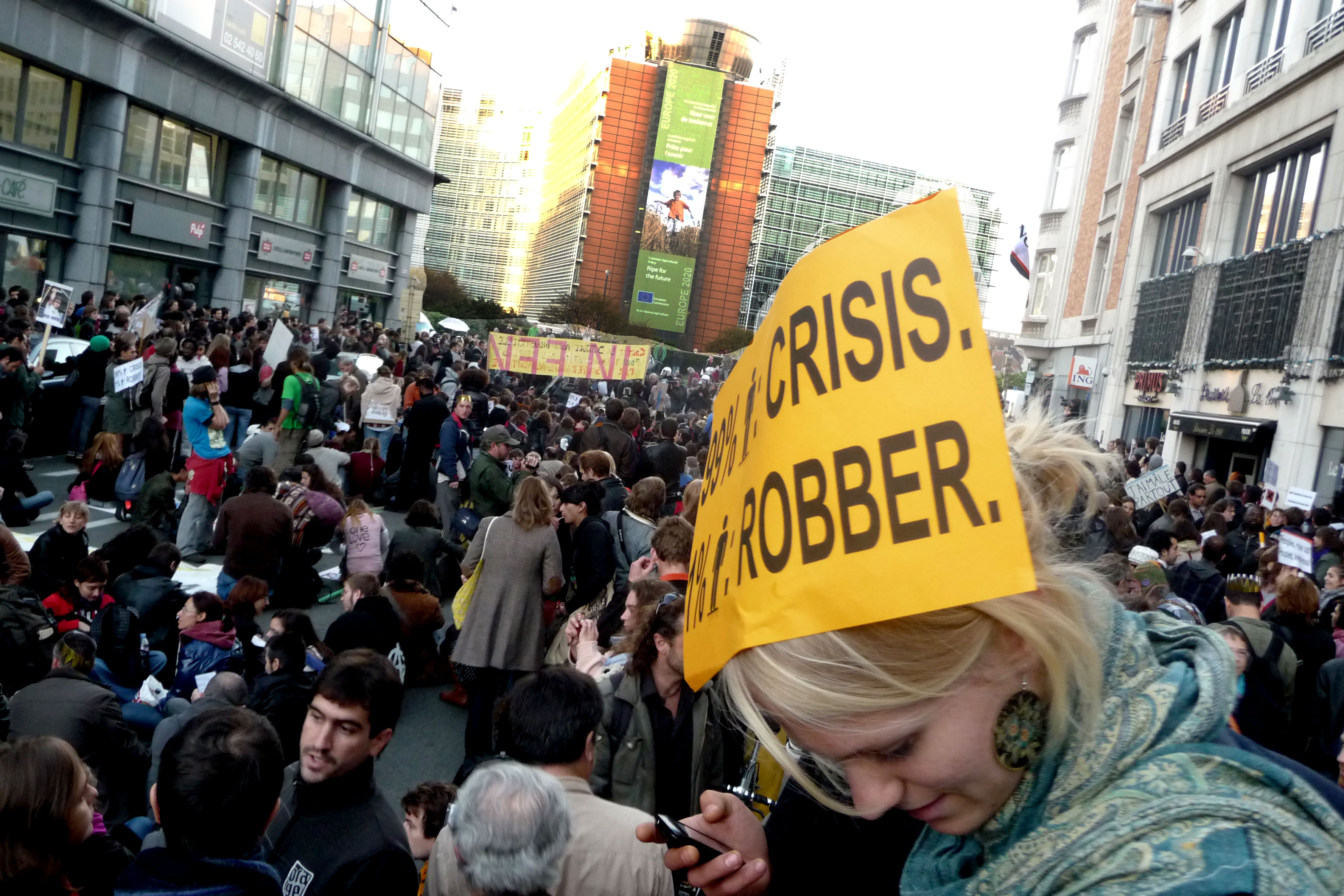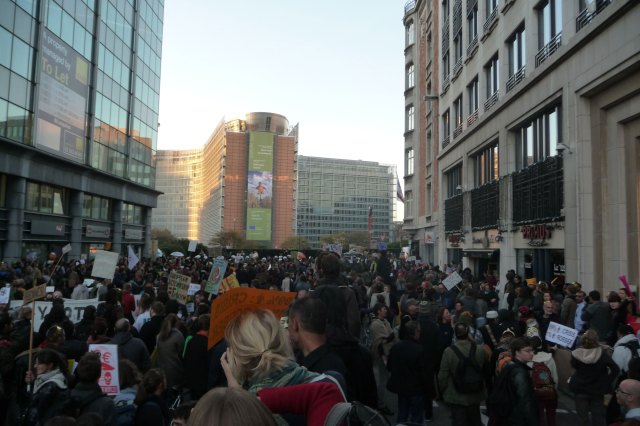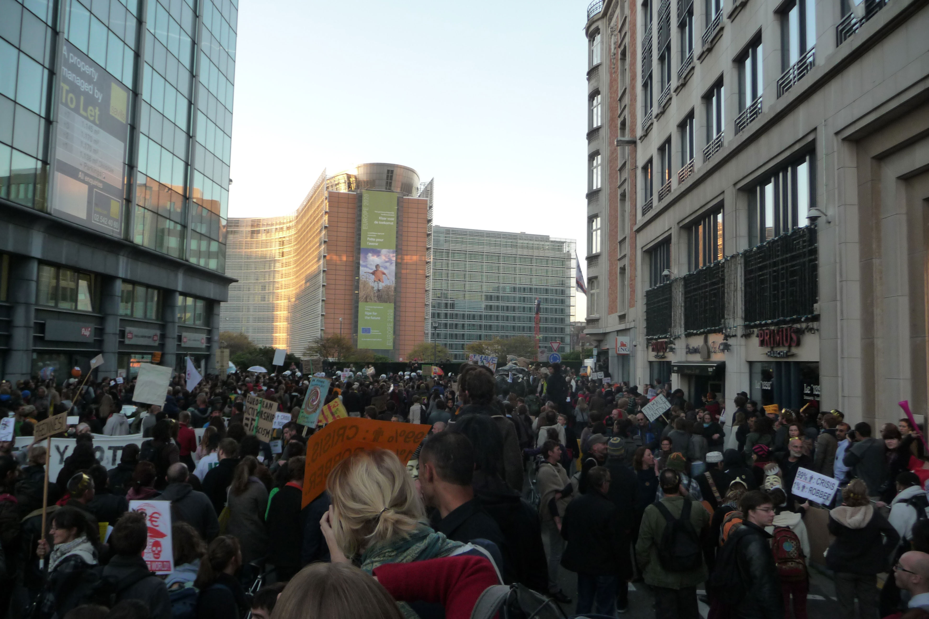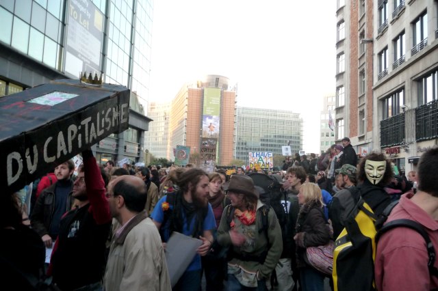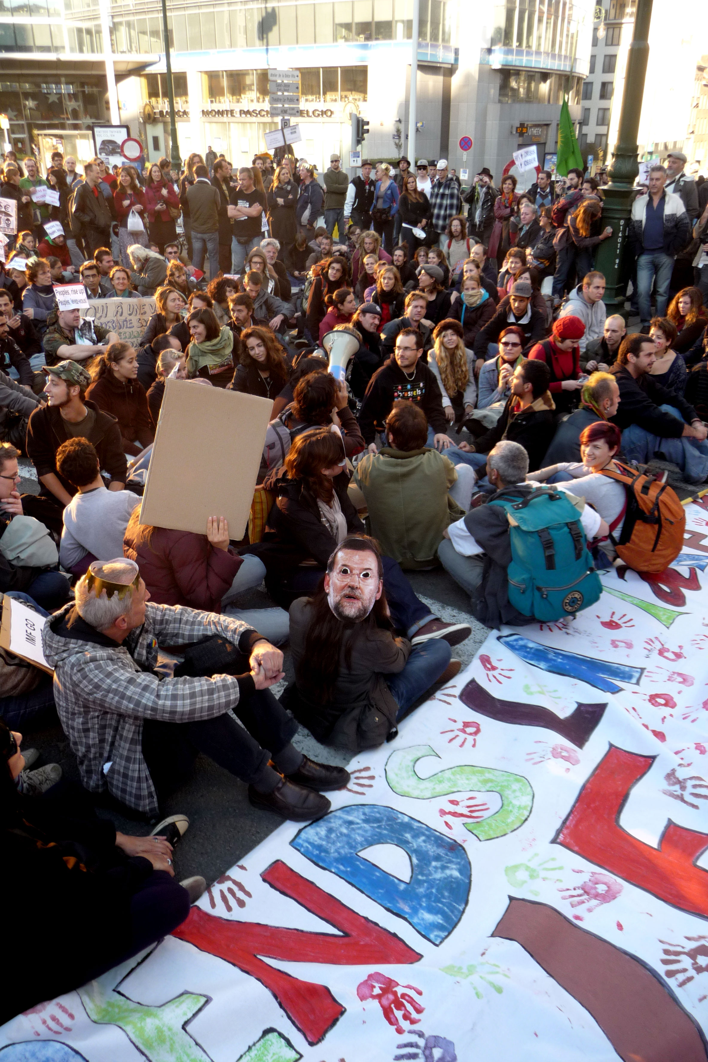 Los manifestantes llegaron a ser gaseados y bloqueados en una calle. La policía no dejaba salir ni siquiera a los niños. De repente la manifestación se calmó, y pese a algún momento surrealista, otra vez con niños de por medio, todo acabó tranquilamente bajo la lluvia y con una asamblea popular en la estación de Luxemburgo, a un paso del Parlamento Europeo. Es lo que tiene Bruxelles, la belle.