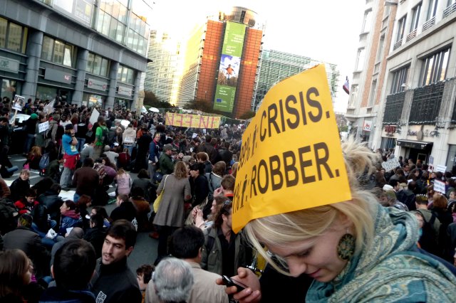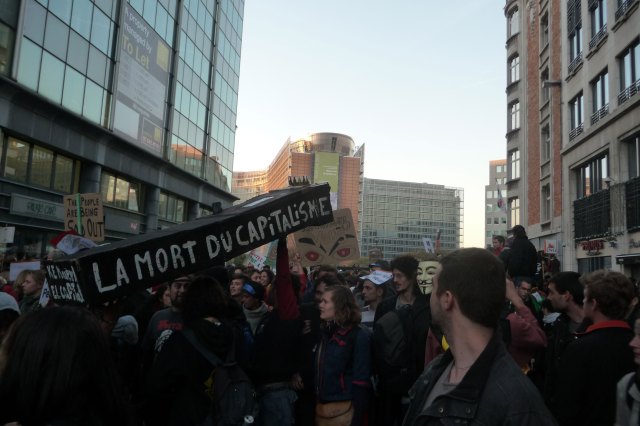 La diversité des banderoles donnent un bon aperçu de l’ambiance: ‘ils ne nous représentent pas’, ‘les mesures d’austérité appliquez-les dans vos conflits armés’, ‘la vraie violence est celle qui te fait gagner 600 euros/mois’, ‘si vous nous laissez pas rêver on ne vous laissera pas dormir’, ‘mains dans l’air, ceci est un contrat d’embauche’ etc.