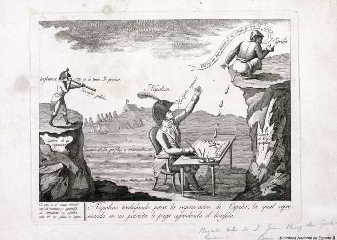 Esta delirante frase está sacada del primer «catecismo político-religioso» de 1808. La invasión napoleónica caldeó mucho los ánimos como muestran el fragmento de texto y la sátira sobre Napoleón que reproducimos. No tienen desperdicio.