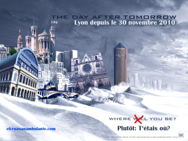 Pequeño chiste visual con la magistral -en su género, el de la catástrofe apocalítpica- El Día de Mañana. Ponemos los monumentos lyoneses y cambiamos el ¿dónde estarás? por ¿dónde estabas?. El alcalde de Lyon Gerard Collomb ha dicho que no hay suficientes medios para estas nevadas excepcionales porque «Lyon no es Montreal».