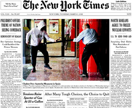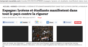 Mais hier un membre du gouvernement espagnol -le nouveau, celui de droite- a dit que les épisodes récents de violences en Espagne après des manifs contre les mesures d’austérité à Valencia et Barcelona donnent une fausse image du pays. Je suis d’accord.